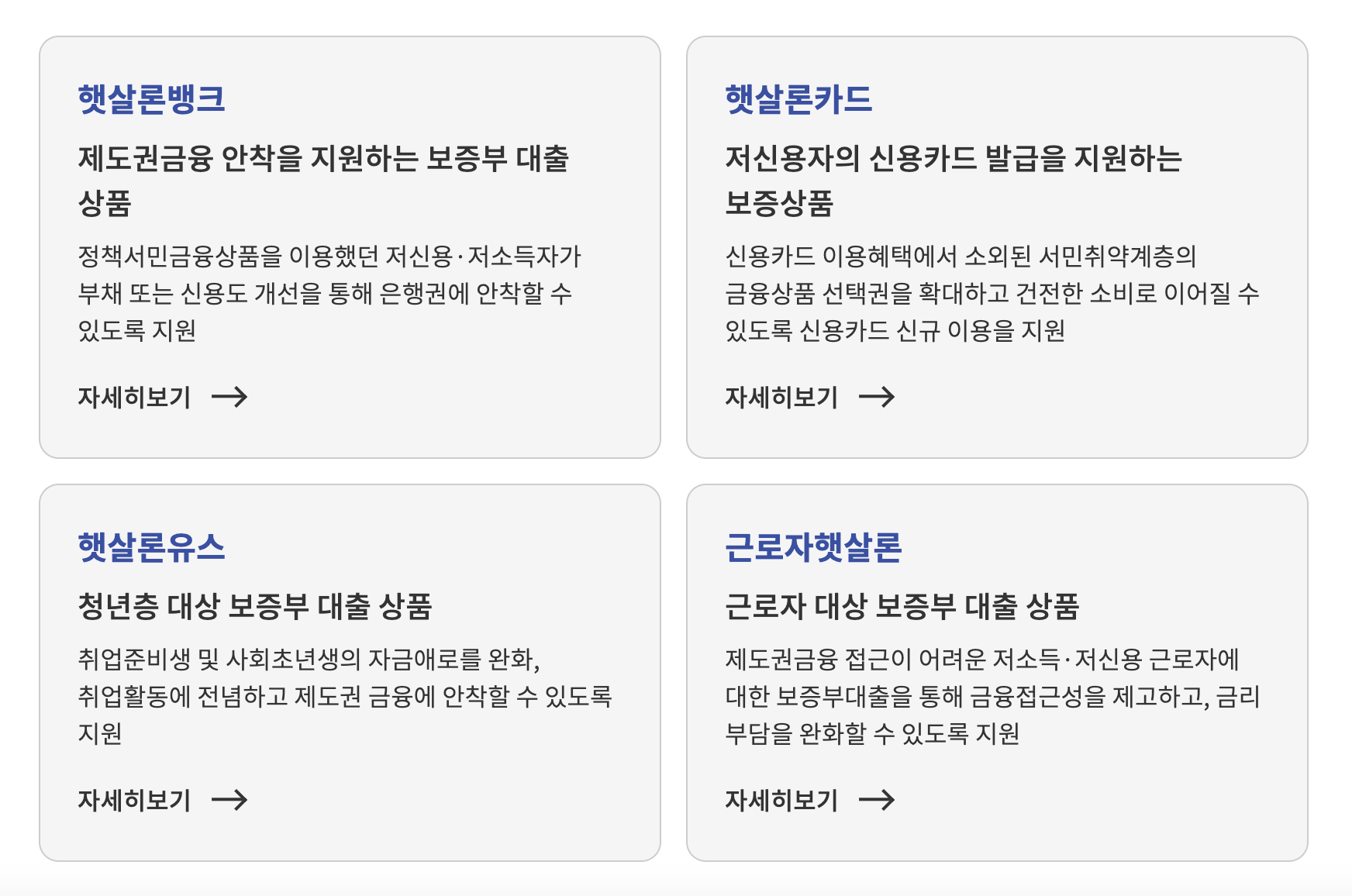 서민금융진흥원에서 지원해주고 있는 대출 상품은 근로자햇살론, 햇살론뱅크, 햇살론카드, 햇살론유스의 상품들이 있습니다.