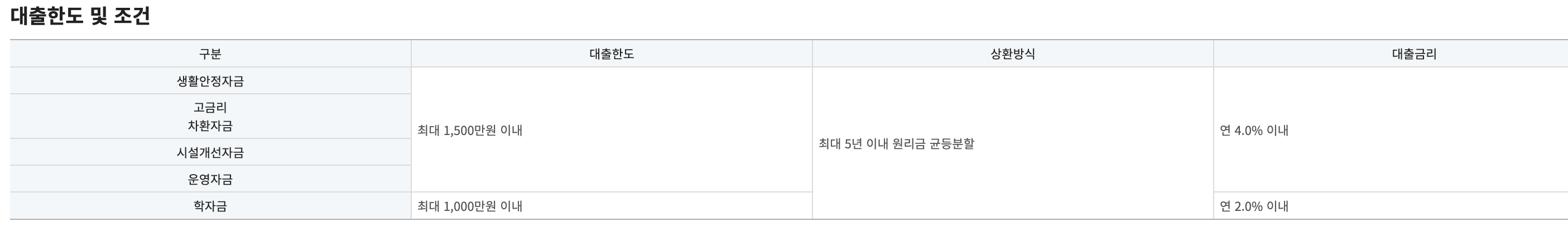대출한도 및 조건 같은 경우 생계비, 고금리 대환, 시설개선, 운용용으로 대출을 받을 수 있었으며, 최대 천오백만 원, 학자금으로 사용 시 최대 천만 원까지 대출이 가능했습니다. 대출의 금리는 2~4%로 금리가 높지 않았습니다.