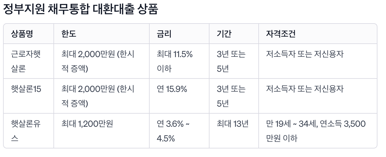 주로 정부지원, 1금융권, 2금융권 상품이 이에 해당합니다.