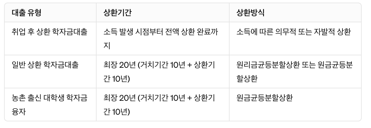 취업 후 상환 학자금대출의 경우, 취업 후 소득이 발생하면 소득 수준에 따라 상환하게 되며, 일반 상환 학자금대출은 거치기간 후 원리금균등분할상환 또는 원금균등분할상환 방식으로 상환합니다.
